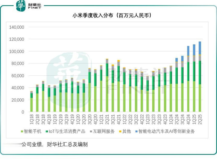 第2季收入为1,159.56亿元(单位人民币,下同),创历史新高,同比增长30.45%,其中手机和AIoT分部收入按年增长14.75%,至946.93亿元,智能电动汽车及AI等创新业务分部收入则达到212.63亿元,按年增长233.87%。两个主营业务分部收入均创历史新高。小米第2季经调整净利润为108亿元,创历史新高,同比增长75.4%。